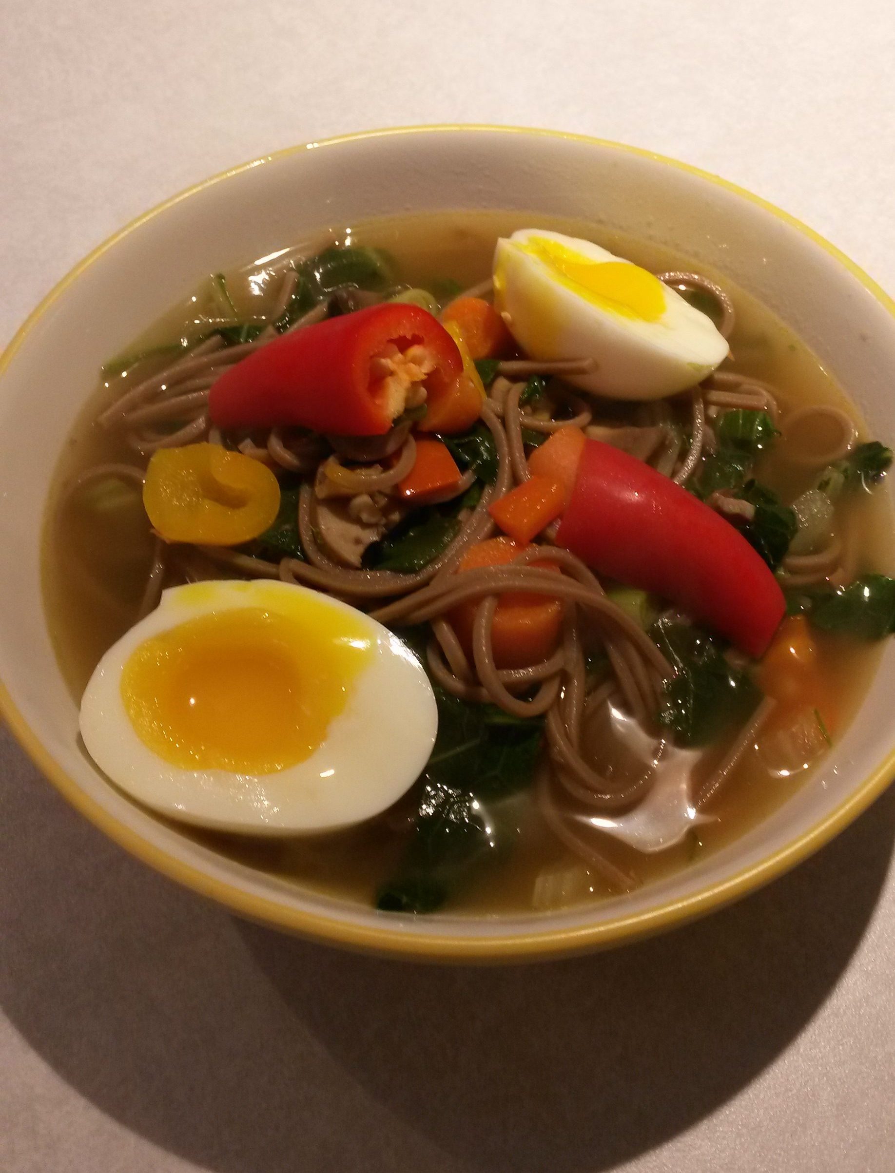 A fast meal for a weeknight Makes four 1 1/2 cup servings Ingredients 8 cups water 6 oz Soba noodles, or linguine 1/2 cup chicken…